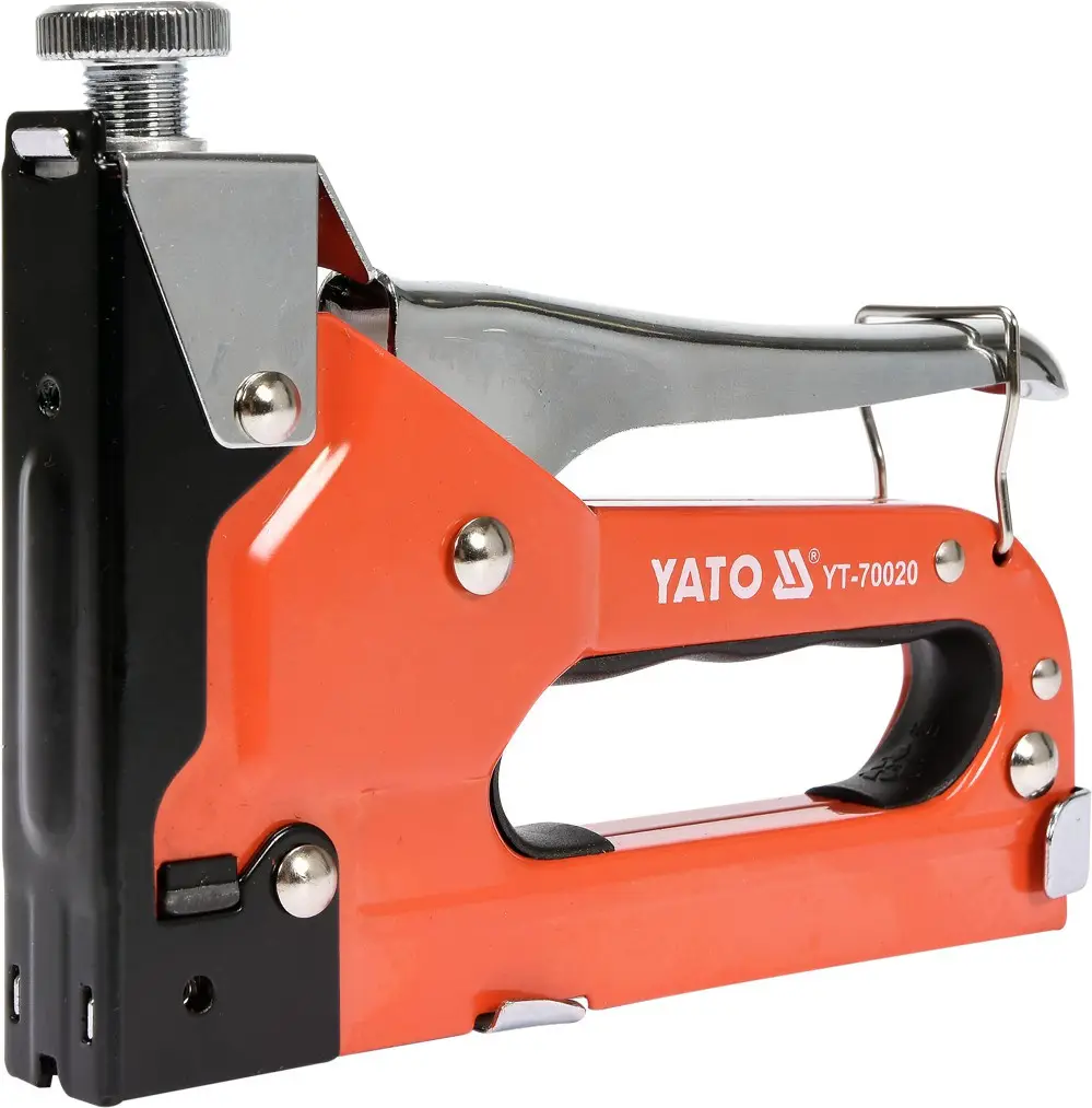 Степлер YATO YT-70020 предназначен для крепления материала к поверхностям из дерева, ДВП, гипсокартона, пластика с использованием прямоугольных скоб размером 4-14 мм, полукруглых скоб 10-12 мм и гвоздей 10-14 мм. Металлический корпус и ручка обеспечивает удобство в работе. Регулируемый пружинный барабан позволяет контролировать силу удара в большом диапазоне.